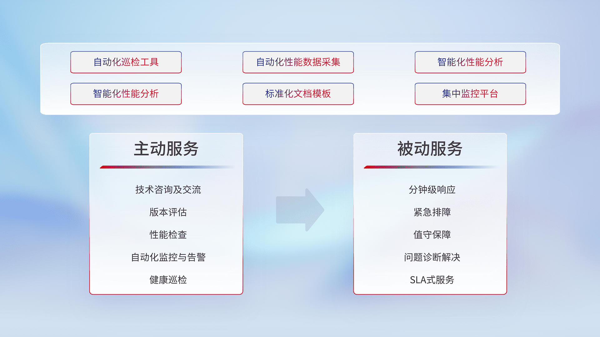 智能化工具和标准化文档,,,保障服务质量,,提供主动服务(包含技术咨询、、、、版本评估、、、、性能检查、、、自动化监控与告警、、健康巡检)和被动服务包含(分钟级响应、、、紧急排障、、、值守保障、、问题诊断解决、、、、SLA服务)。。。。