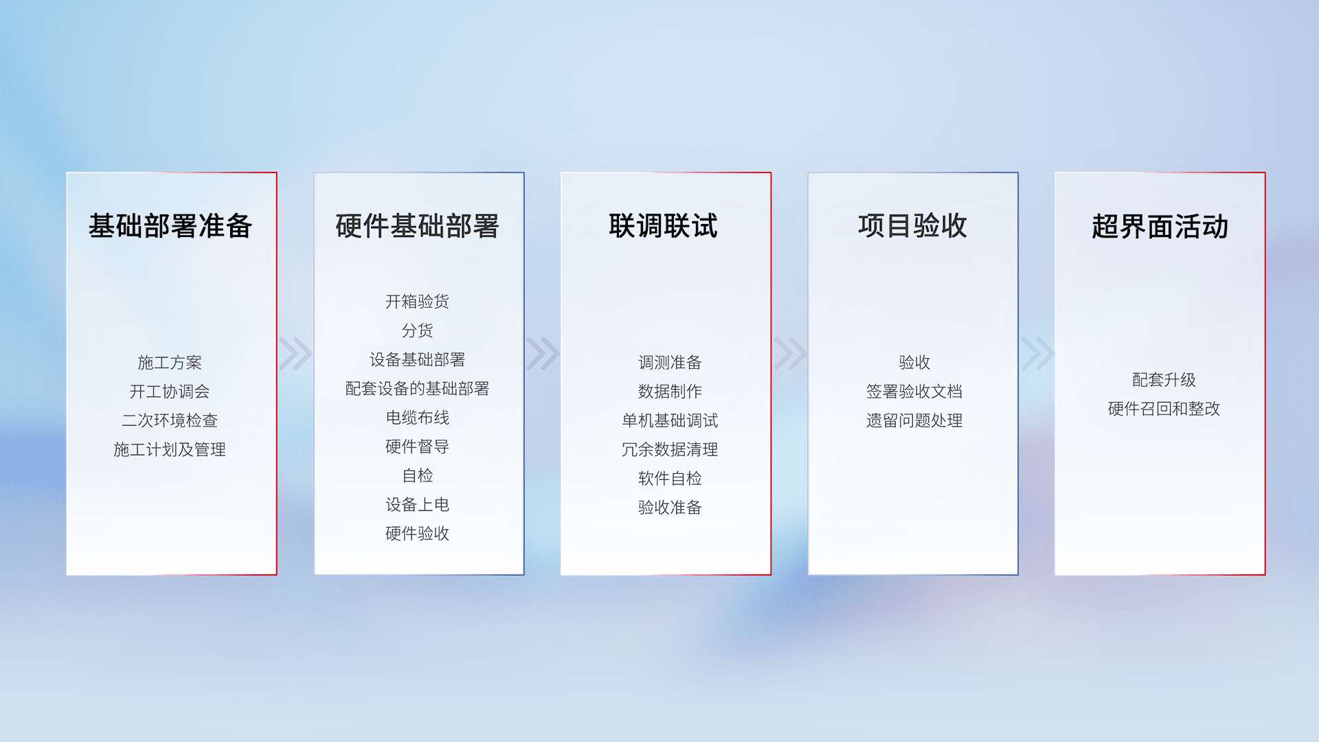 从基础部署准备、、、、硬件基础部署、、联调联试、、、项目验收、、、越界面活动的全过程可追溯,,保证施工质量和进度。。